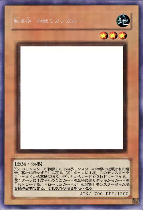 | ①このモンスターが戦闘または相手モンスターの効果で破壊された場合、墓地に行かず手札に戻る。②1ターンに1度、このモンスターをフィールドから墓地に送り、デッキからカードを2枚ドローできる。③1ターンに1度手札のこのカードを墓地に送りデッキからカードを1枚ドローする、ドローしたカードが「動果物」モンスターだった場合特殊召喚できる。それ以外の場合墓地へ送る。 | |||
