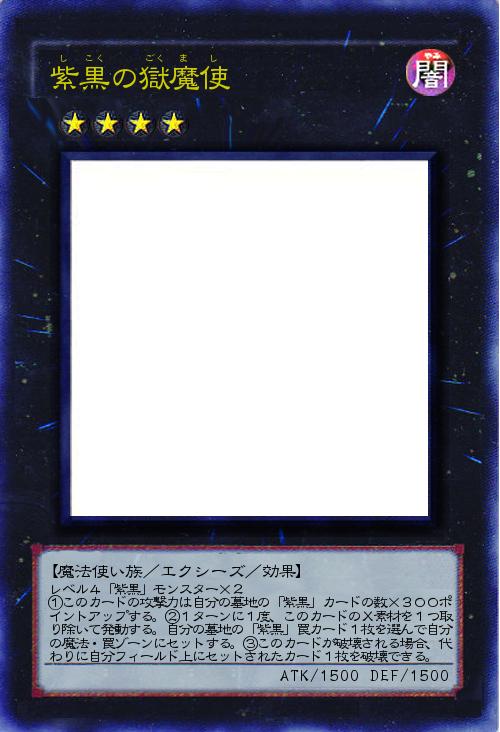 レベル4「紫黒」モンスター×2 ①このカードの攻撃力は自分の墓地の「紫黒」カードの数×300ポイントアップする。②1ターンに1度、このカードのX素材を1つ取り除いて発動する。自分の墓地の「紫黒」罠カード1枚を選んで自分の魔法・罠ゾーンにセットする。③このカードが破壊される場合、代わりに自分フィールド上にセットされたカード1枚を破壊できる。 |