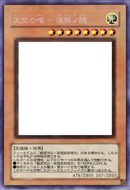 フィールド上に「最高天位・非想非非想天」がある場合のみ、このカードは手札から特殊召喚できる。 このカードの召喚時、以下のうち一つの効果を選んで発動できる。 ●デッキから「最高天位・非想非非想天」を1枚手札に加える。 ●相手フィールド上の魔法・罠カードを全て破壊する。 このカードは召喚したターンのエンドフェイズに墓地へ送られる。 |