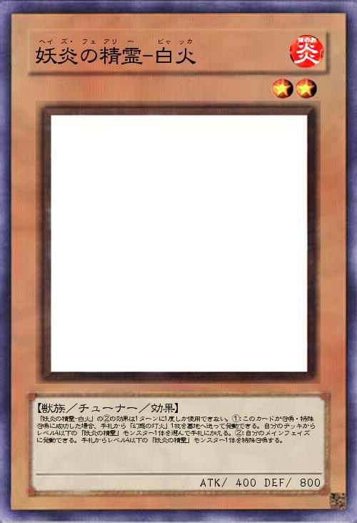| 「妖炎の精霊-白火」の②の効果は1ターンに1度しか使用できない。①:このカードが召喚・特殊召喚に成功した場合、手札から「幻惑の灯火」1枚を墓地へ送って発動できる。自分のデッキからレベル4以下の「妖炎の精霊」モンスター1体を選んで手札に加える。②:自分のメインフェイズに発動できる。手札からレベル4以下の「妖炎の精霊」モンスター1体を特殊召喚する。 | |||