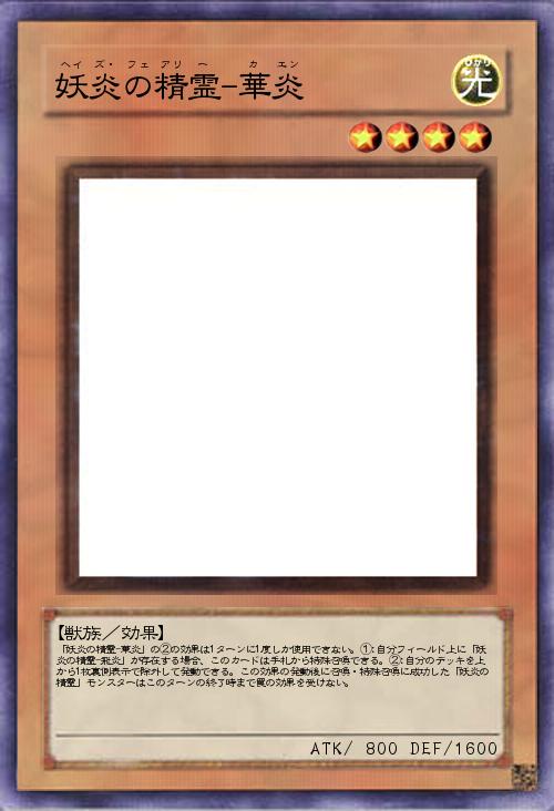 | 「妖炎の精霊-華炎」の②の効果は1ターンに1度しか使用できない。①:自分フィールド上に「妖炎の精霊-飛炎」が存在する場合、このカードは手札から特殊召喚できる。②:自分のデッキを上から1枚裏側表示で除外して発動できる。この効果の発動後に召喚・特殊召喚に成功した「妖炎の精霊」モンスターはこのターンの終了時まで罠の効果を受けない。 | |||