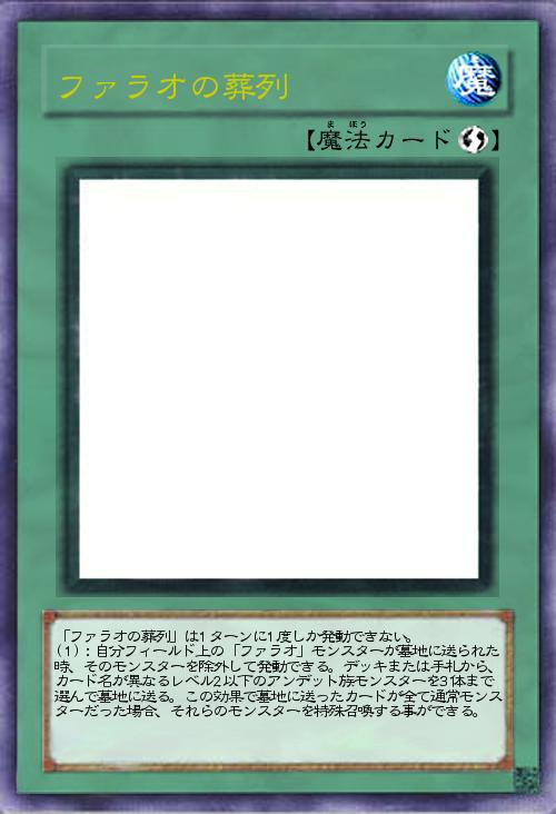「ファラオの葬列」は1ターンに1度しか発動できない。 (1):自分フィールド上の「ファラオ」モンスターが墓地に送られた時、そのモンスターを除外して発動できる。デッキまたは手札から、カード名が異なるレベル2以下のアンデット族モンスターを3体まで選んで墓地に送る。この効果で墓地に送ったカードが全て通常モンスターだった場合、それらのモンスターを特殊召喚する事ができる。 |