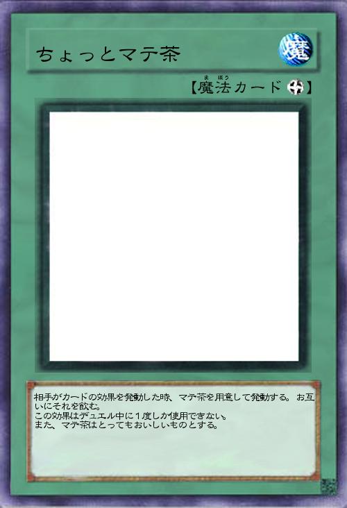 相手がカードの効果を発動した時、マテ茶を用意して発動する。お互いにそれを飲む。 この効果はデュエル中に1度しか使用できない。 また、マテ茶はとってもおいしいものとする。 |