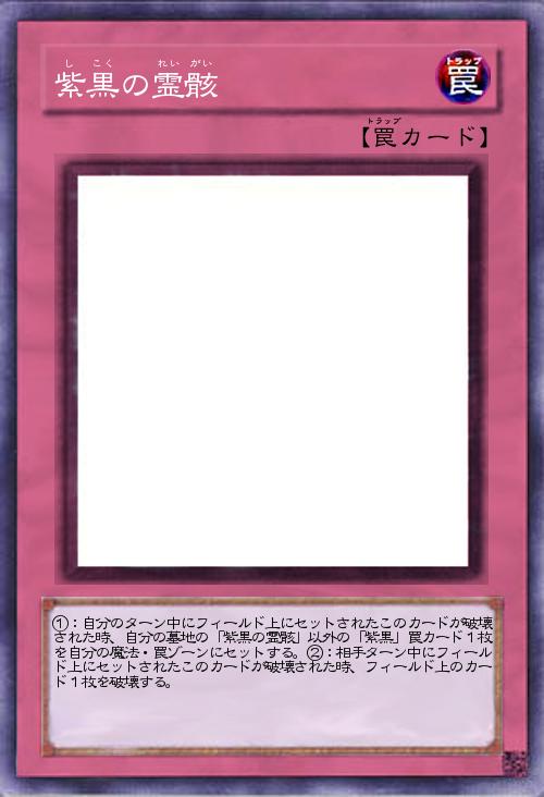 | ①:自分のターン中にフィールド上にセットされたこのカードが破壊された時、自分の墓地の「紫黒の霊骸」以外の「紫黒」罠カード1枚を自分の魔法・罠ゾーンにセットする。②:相手ターン中にフィールド上にセットされたこのカードが破壊された時、フィールド上のカード1枚を破壊する。 | |||