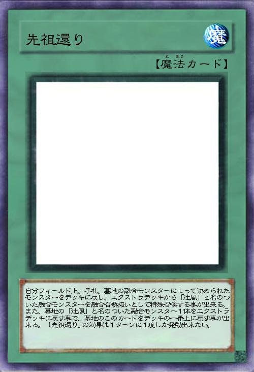 | 自分フィールド上、手札、墓地の融合モンスターによって決められたモンスターをデッキに戻し、エクストラデッキから「辻風」と名のついた融合モンスターを融合召喚扱いとして特殊召喚する事が出来る。また、墓地の「辻風」と名のついた融合モンスター1体をエクストラデッキに戻す事で、墓地のこのカードをデッキの一番上に戻す事が出来る。「先祖還り」の効果は1ターンに1度しか発動出来ない。 | |||