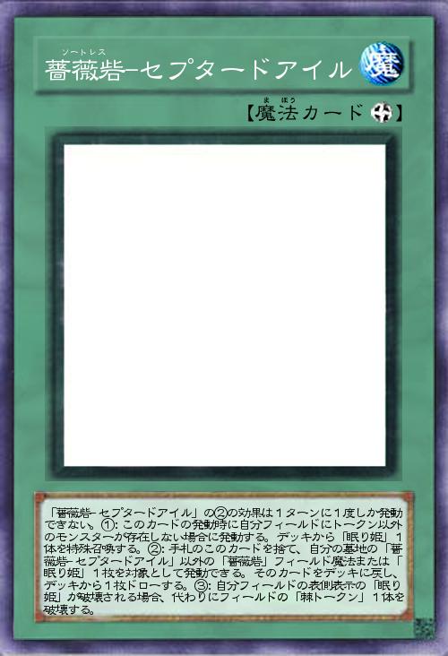 | 「薔薇砦-セプタードアイル」の②の効果は1ターンに1度しか発動できない。①:このカードの発動時に自分フィールドにトークン以外のモンスターが存在しない場合に発動する。デッキから「眠り姫」1体を特殊召喚する。②:手札のこのカードを捨て、自分の墓地の「薔薇砦-セプタードアイル」以外の「薔薇砦」フィールド魔法または「眠り姫」1枚を対象として発動できる。そのカードをデッキに戻し、デッキから1枚ドローする。③:自分フィールドの表側表示の「眠り姫」が破壊される場合、代わりにフィールドの「棘トークン」1体を破壊する。 | |||