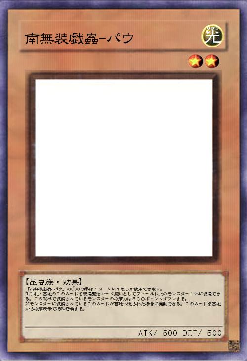 「南無装戯蟲-パウ」の①の効果は1ターンに1度しか使用できない。 ①手札・墓地のこのカードを装備魔法カード扱いとしてフィールド上のモンスター1体に装備できる。この効果で装備されているモンスターの攻撃力は500ポイントダウンする。 ②モンスターに装備されているこのカードが墓地へ送られた場合に発動できる。このカードを墓地から攻撃表示で特殊召喚する。 |