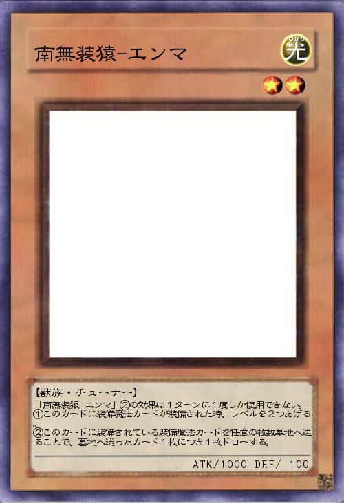 「南無装猿-エンマ」②の効果は1ターンに1度しか使用できない。 ①このカードに装備魔法カードが装備された時、レベルを2つあげる。 ②このカードに装備されている装備魔法カードを任意の枚数墓地へ送ることで、墓地へ送ったカード1枚につき1枚ドローする。 |