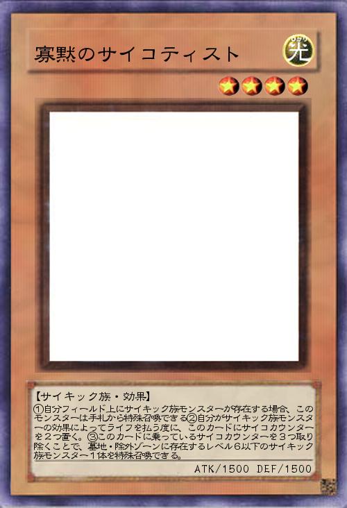| ①自分フィールド上にサイキック族モンスターが存在する場合、このモンスターは手札から特殊召喚できる②自分がサイキック族モンスターの効果によってライフを払う度に、このカードにサイコカウンターを2つ置く。③このカードに乗っているサイコカウンターを3つ取り除くことで、墓地・除外ゾーンに存在するレベル6以下のサイキック族モンスター1体を特殊召喚できる。 | |||