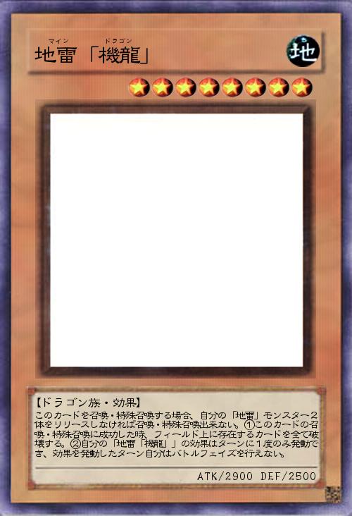 | このカードを召喚・特殊召喚する場合、自分の「地雷」モンスター2体をリリースしなければ召喚・特殊召喚出来ない。①このカードの召喚・特殊召喚に成功した時、フィールド上に存在するカードを全て破壊する。②自分の「地雷「機龍」」の効果はターンに1度のみ発動でき、効果を発動したターン自分はバトルフェイズを行えない。 | |||