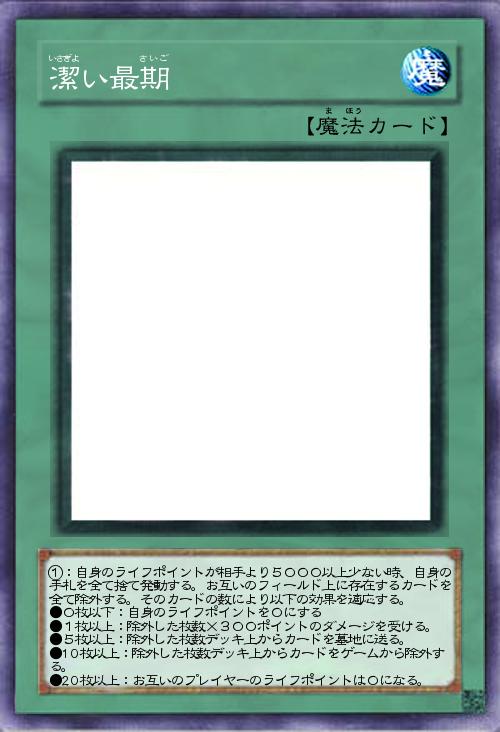 ①:自身のライフポイントが相手より5000以上少ない時、自身の手札を全て捨て発動する。お互いのフィールド上に存在するカードを全て除外する。そのカードの数により以下の効果を適応する。 ●0枚以下:自身のライフポイントを0にする ●1枚以上:除外した枚数×300ポイントのダメージを受ける。 ●5枚以上:除外した枚数デッキ上からカードを墓地に送る。 ●10枚以上:除外した枚数デッキ上からカードをゲームから除外する。 ●20枚以上:お互いのプレイヤーのライフポイントは0になる。 |