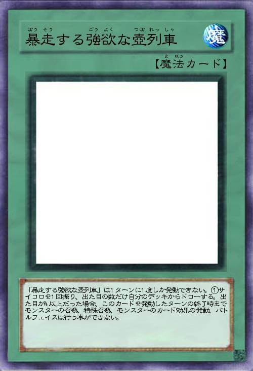 | 「暴走する強欲な壺列車」は1ターンに1度しか発動できない。①サイコロを1回振り、出た目の数だけ自分のデッキからドローする。出た目が4以上だった場合、このカードを発動したターンの終了時までモンスターの召喚、特殊召喚、モンスターのカード効果の発動、バトルフェイスは行う事ができない。 | |||