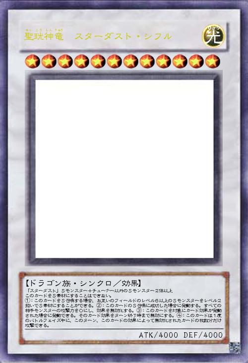 「スターダスト」Sモンスター+チューナー以外のSモンスター2体以上 このカードをS素材にすることはできない。 ①:このカードをS召喚する場合、お互いのフィールドのレベル6以上のSモンスターをレベル2扱いでS素材にすることができる。②:このカードのS召喚に成功した場合に発動する。すべての相手モンスターの攻撃力を0にし、効果を無効化する。③:このカードを対象にカード効果が発動された場合に発動できる。そのカード効果をターン終了時まで無効にする。④:このカードは1度のバトルフェイズ中に、このターン、このカードの効果によって無効化されたカードの枚数分だけ攻撃できる。 |