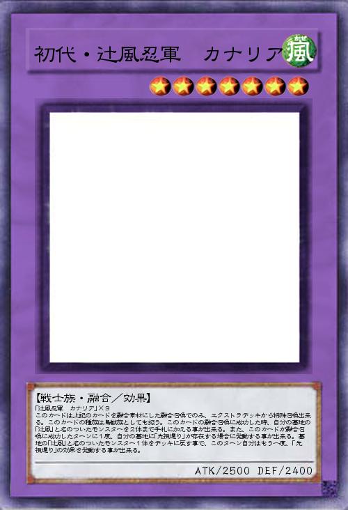 「辻風忍軍 カナリア」×3 このカードは上記のカードを融合素材にした融合召喚でのみ、エクストラデッキから特殊召喚出来る。このカードの種族は鳥獣族としても扱う。このカードの融合召喚に成功した時、自分の墓地の「辻風」と名のついたモンスターを2体まで手札に加える事が出来る。また、このカードが融合召喚に成功したターンに1度、自分の墓地に「先祖還り」が存在する場合に発動する事が出来る。墓地の「辻風」と名のついたモンスター1体をデッキに戻す事で、このターン自分はもう一度、「先祖還り」の効果を発動する事が出来る。 |