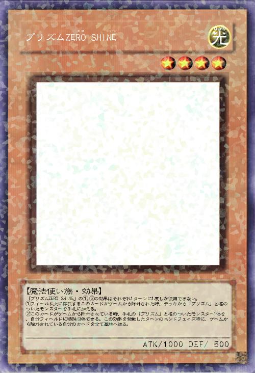 「プリズムZERO SHINE」の①,②の効果はそれぞれ1ターンに1度しか使用できない。 ①フィールド上に存在するこのカードがゲームから除外された時、デッキから「プリズム」と名のついたモンスターを手札に加える。 ②このカードがゲームから除外されている時、手札の「プリズム」と名のついたモンスター1体を、自分フィールドに特殊召喚できる。この効果を発動したターンのエンドフェイズ時に、ゲームから除外されている自分のカードを全て墓地へ送る。 |