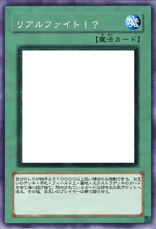 | 自分のLPが相手より10000以上低い場合のみ発動できる。お互いのデッキ・手札・フィールド上・墓地・エクストラデッキのカードを全て海へ投げ捨て、除外されているカードは持ち主の尻ポケットへ送る。その後、お互いのプレイヤーは拳で語り合う。 | |||