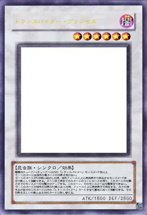 闇属性チューナー+チューナー以外の「トランスパイダー」モンスター1体以上 (1):このカードは相手の罠カードの効果を受けない。 (2):このカードがS召喚に成功した時、相手フィールド上に表側表示で存在するモンスター1体を対象として発動できる。ターン終了時までそのカードのコントロールを得て、このカードの攻撃力をそのモンスターの攻撃力分アップする。このターン、そのモンスターは攻撃宣言できない。 (3):このカードが相手の効果の対象になった時、フィールド上に表側表示で存在する、元々の持ち主が自分のこのカード以外の「トランスパイダー」カードを全て墓地に送って発動できる。その効果を正しい対象となる別のカードに移し替える。 |