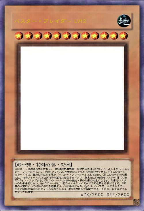 | このカードは通常召喚できない。「熟達の白魔導師」の効果または自分のフィールド上から「バスター・ブレイダー LV10」1体をリリースした場合のみ手札から特殊召喚できる。①:このカードのカード名は、墓地に存在する限り「バスター・ブレイダー」として扱う。②:このカードの攻撃力は、相手フィールド上及び相手の墓地に存在するドラゴン族または幻竜族モンスター1体につき500ポイントアップする。③:このカードは相手の魔法・罠の効果の対象にならず、効果モンスターの効果を受けない。④:このカードは1度のバトルフェイズ中に2回攻撃する事ができる。2回目の攻撃によって相手に与える戦闘ダメージは半分になる。⑤:1ターンに1度、エクストラデッキから特殊召喚されたフィールドのモンスター1体を選択して発動できる。そのカードをエクストラデッキに戻す。 | |||