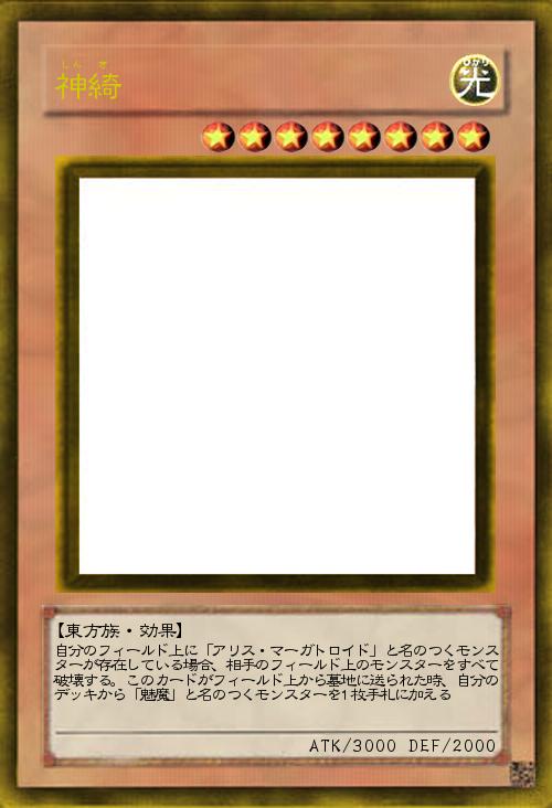 | 自分のフィールド上に「アリス・マーガトロイド」と名のつくモンスターが存在している場合、相手のフィールド上のモンスターをすべて破壊する。このカードがフィールド上から墓地に送られた時、自分のデッキから「魅魔」と名のつくモンスターを1枚手札に加える | |||
