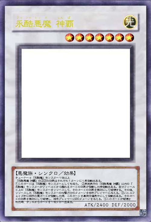 チューナー+「永酷魔」モンスター1体以上 「永酷悪魔 神覇」の②③の効果はそれぞれ1ターンに1度発動出来る。 ①このカードは「永酷魔」モンスターとしても扱う。 ②表側表示の「永酷悪魔 神覇」以外の「永酷魔」モンスターがフィールドから離れるカードの効果が発動した時発動出来る。自分フィールド上の「永酷魔」モンスターをリリースして、そのカードの効果を無効にして破壊する。その後、リリースした「永酷魔」モンスターの攻撃力分のダメージを相手プレイヤーに与える。③バトルフェイズ中に相手の罠カードが発動した時、このカードを裏側守備表示にして発動出来る。そのカードの効果を無効にして破壊し、相手プレイヤーに900ダメージを与える。④このカードが破壊された時、デッキからカードを1枚ドロー出来る。 |
