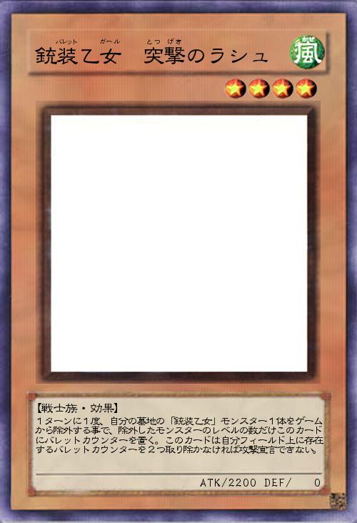 | 1ターンに1度、自分の墓地の「銃装乙女」モンスター1体をゲームから除外する事で、除外したモンスターのレベルの数だけこのカードにバレットカウンターを置く。このカードは自分フィールド上に存在するバレットカウンターを2つ取り除かなければ攻撃宣言できない。 | |||