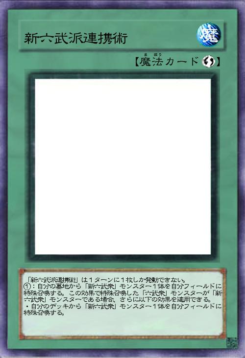 「新六武派連携術」は1ターンに1枚しか発動できない。 ①:自分の墓地から「新六武衆」モンスター1体を自分フィールドに特殊召喚する。この効果で特殊召喚した「六武衆」モンスターが「新六武衆」モンスターである場合、さらに以下の効果を適用できる。 ・自分のデッキから「新六武衆」モンスター1体を自分フィールドに特殊召喚する。 |