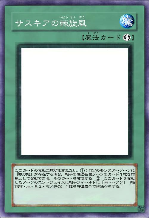 | このカードの発動は無効化されない。①:自分のモンスターゾーンに「眠り姫」が存在する場合、相手の魔法&罠ゾーンのカード1枚を対象として発動できる。そのカードを破壊する。②:このカードを発動したターンのエンドフェイズに相手フィールドに「棘トークン」(植物族・地・星2・攻/守0)1体を守備表示で特殊召喚する。 | |||