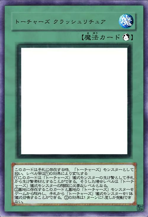 このカードは手札に存在する時、「トーチャーズ」モンスターとして扱い、レベル等は①の効果により変化する ①このカードは「トーチャーズ」儀式モンスターの生け贄として手札から生け贄素材とすることができる。そうした場合レベルは「トーチャーズ」儀式モンスターの降臨に必要なレベルとなる。 ②墓地に存在するこのカードと墓地の「トーチャーズ」モンスターをゲームから除外し、手札から「トーチャーズ」儀式モンスターを1体儀式召喚することができる。②の効果は1ターンに1度しか発動できない。 |