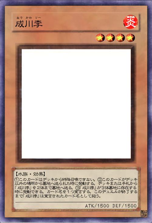 | ①このカードはデッキから特殊召喚できない。②このカードがデッキ以外の場所から墓地へ送られた時に発動する。デッキまたは手札から「成川李」を2体まで墓地へ送る。③「成川李」が3体墓地に存在する時に発動できる。カード名を1つ宣言する。このデュエルが終了するまで「成川李」は宣言されたカード名として扱う。 | |||