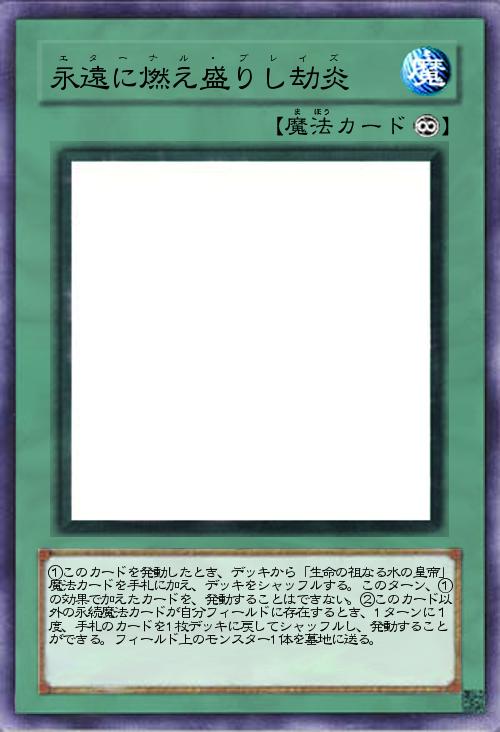 | ①このカードを発動したとき、デッキから「生命の祖なる水の皇帝」魔法カードを手札に加え、デッキをシャッフルする。このターン、①の効果で加えたカードを、発動することはできない。②このカード以外の永続魔法カードが自分フィールドに存在するとき、1ターンに1度、手札のカードを1枚デッキに戻してシャッフルし、発動することができる。フィールド上のモンスター1体を墓地に送る。 | |||
