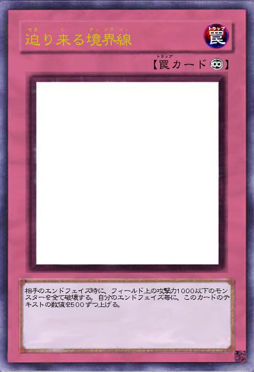 | 相手のエンドフェイズ時に、フィールド上の攻撃力1000以下のモンスターを全て破壊する。自分のエンドフェイズ毎に、このカードのテキストの数値を500ずつ上げる。 | |||