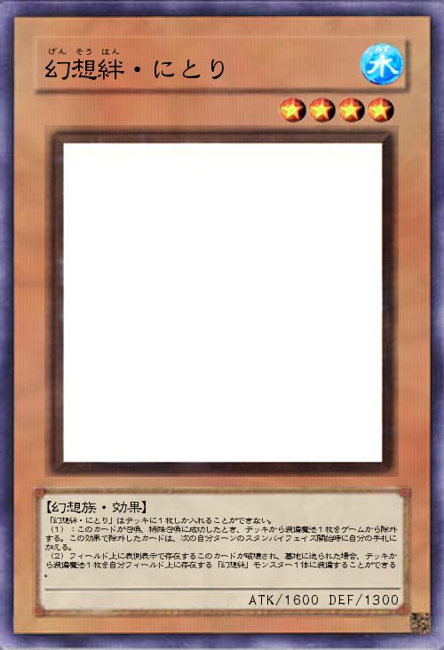 「幻想絆・にとり」はデッキに1枚しか入れることができない。 (1):このカードが召喚、特殊召喚に成功したとき、デッキから装備魔法1枚をゲームから除外する。この効果で除外したカードは、次の自分ターンのスタンバイフェイズ開始時に自分の手札に加える。 (2)フィールド上に表側表示で存在するこのカードが破壊され、墓地に送られた場合、デッキから装備魔法1枚を自分フィールド上に存在する「幻想絆」モンスター1体に装備することができる。 |