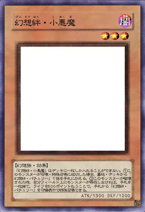 | 「幻想絆・小悪魔」はデッキに一枚しか入れることができない。①このモンスターが召喚・特殊召喚に成功した場合、墓地・デッキから「幻想絆・パチュリー」1体を手札に加える。②このモンスターが破壊された時、自分フィールド上にモンスターが存在しなければ、手札を一枚捨て、ライフを500ポイント払うことで、手札から「幻想絆・パチュリー」を守備表示で特殊召喚できる。 | |||