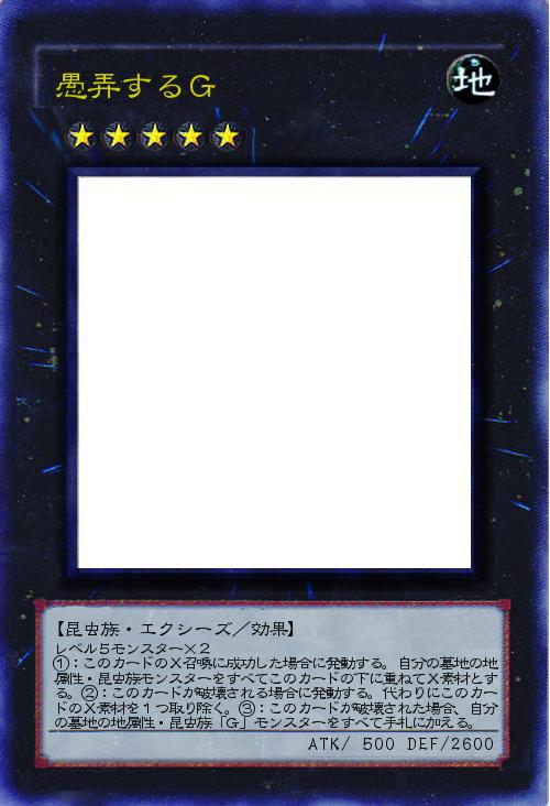 レベル5モンスター×2 ①:このカードのX召喚に成功した場合に発動する。自分の墓地の地属性・昆虫族モンスターをすべてこのカードの下に重ねてX素材とする。②:このカードが破壊される場合に発動する。代わりにこのカードのX素材を1つ取り除く。③:このカードが破壊された場合、自分の墓地の地属性・昆虫族「G」モンスターをすべて手札に加える。 |