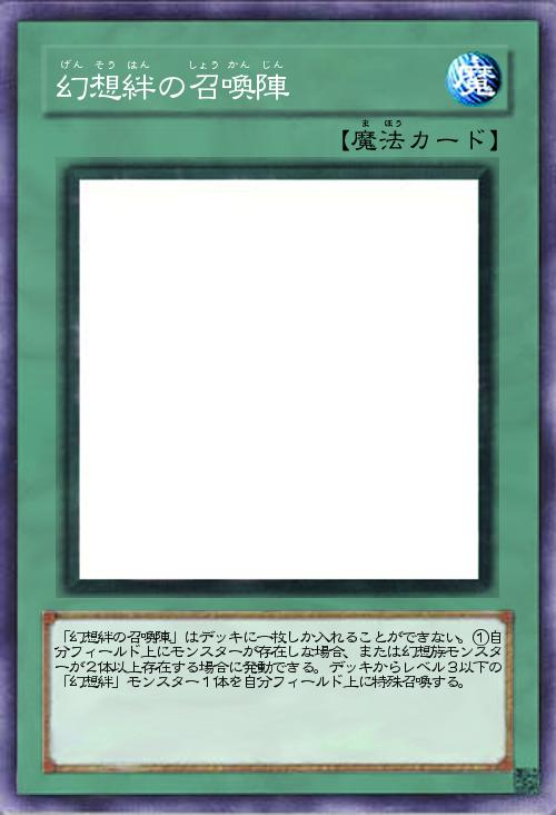 | 「幻想絆の召喚陣」はデッキに一枚しか入れることができない。①自分フィールド上にモンスターが存在しな場合、または幻想族モンスターが2体以上存在する場合に発動できる。デッキからレベル3以下の「幻想絆」モンスター1体を自分フィールド上に特殊召喚する。 | |||