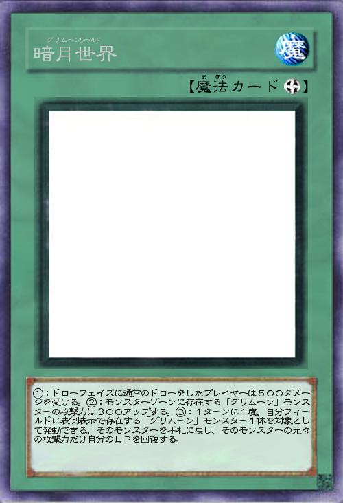 「 新カテゴリ「グリムーン」のフィールド魔法。通常のドローをするとダメージを受ける効果、グリムーンの全体強化、フィールドのグリムーンを回収しながらの回復。三つ目の効果が思いのほか重要だったりする。どういう特性を持ったカテゴリなのかは次回にわかるとおもいます。