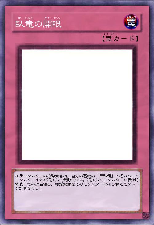| 相手モンスターの攻撃宣言時、自分の墓地の「甲臥竜」と名のついたモンスター1体を選択して発動できる。選択したモンスターを裏側守備表示で特殊召喚し、攻撃対象をそのモンスターに移し替えてダメージ計算を行う。 | |||
