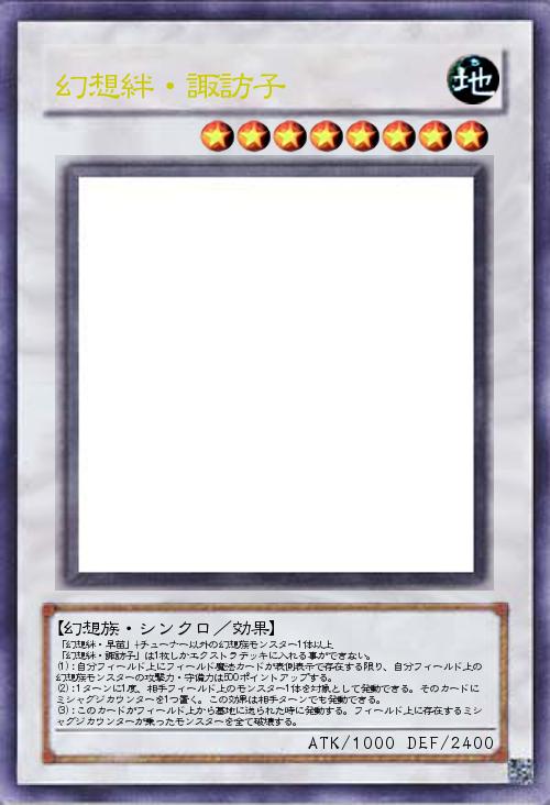 「幻想絆・早苗」+チューナー以外の幻想族モンスター1体以上 「幻想絆・諏訪子」は1枚しかエクストラデッキに入れる事ができない。 (1):自分フィールド上にフィールド魔法カードが表側表示で存在する限り、自分フィールド上の幻想族モンスターの攻撃力・守備力は500ポイントアップする。 (2):1ターンに1度、相手フィールド上のモンスター1体を対象として発動できる。そのカードにミシャグジカウンターを1つ置く。この効果は相手ターンでも発動できる。 (3):このカードがフィールド上から墓地に送られた時に発動する。フィールド上に存在するミシャグジカウンターが乗ったモンスターを全て破壊する。 |