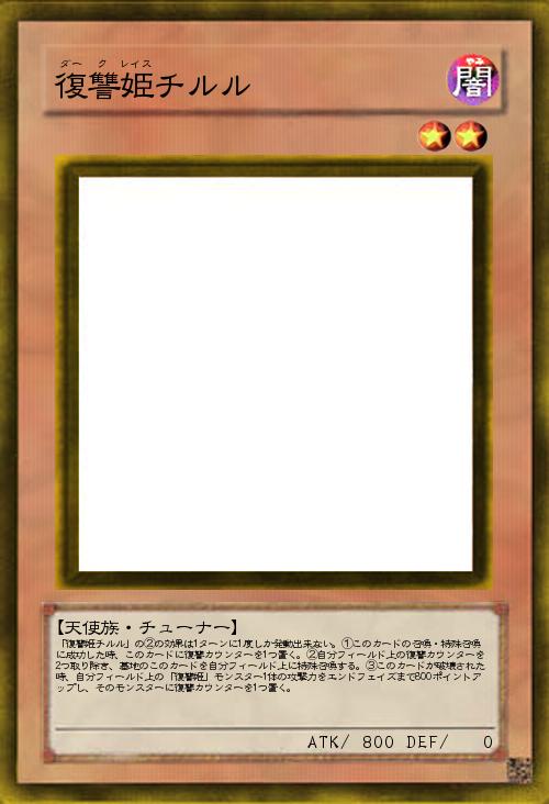 | 「復讐姫チルル」の②の効果は1ターンに1度しか発動出来ない。①このカードの召喚・特殊召喚に成功した時、このカードに復讐カウンターを1つ置く。②自分フィールド上の復讐カウンターを2つ取り除き、墓地のこのカードを自分フィールド上に特殊召喚する。③このカードが破壊された時、自分フィールド上の「復讐姫」モンスター1体の攻撃力をエンドフェイズまで800ポイントアップし、そのモンスターに復讐カウンターを1つ置く。 | |||