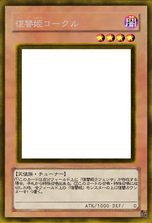 効果は片割れがいれば自身を特殊召喚する効果と、復讐カウンターをばら撒く効果。どちらも単体では機能しないが、ラフェンサとすぐにランク4を作れたりレベル8シンクロに繋げられる。後半は他の「復讐姫」と組み合わせることで光る効果だろう。」(2014-10-28 02:23)