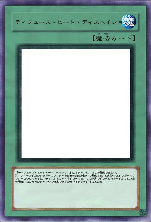 「ディフューズ・ヒート・ディスペイション」は1ターンに1枚しか発動できない。 ①:フィールド上のトリガーカウンターを任意の数取り除いて発動する。取り除いたトリガーカウンター2つにつき1枚、デッキからカードをドローする。この効果でドローしたカードが3枚以上の場合、次の自分のターン終了時まで相手が受けるダメージは0となる。 |