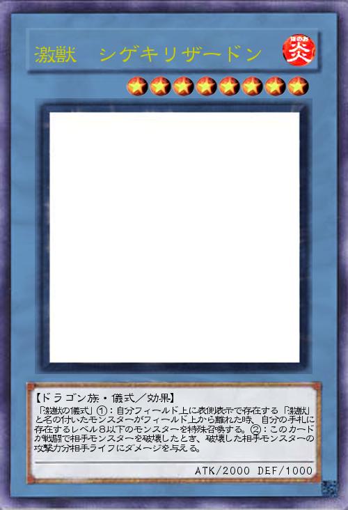 | 「激獣の儀式」①:自分フィールド上に表側表示で存在する「激獣」と名の付いたモンスターがフィールド上から離れた時、自分の手札に存在するレベル8以下のモンスターを特殊召喚する。②:このカードが戦闘で相手モンスターを破壊したとき、破壊した相手モンスターの攻撃力分相手ライフにダメージを与える。 | |||