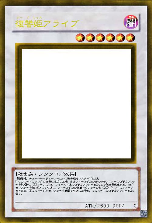 「復讐姫」チューナー+チューナー以外の戦士族モンスター1体以上 ①このカードのシンクロ召喚に成功した時、自分フィールド上の全てのモンスターに復讐カウンターを1つ置く。②1ターンに1度、フィールド上の復讐カウンターを2つ取り除き発動出来る。相手モンスターを1体選択して破壊し、フィールド上の復讐カウンターの数×200ポイントのダメージを与える。③このカードがモンスターを戦闘で破壊した場合、このカードに復讐カウンターを2つ置く。 |