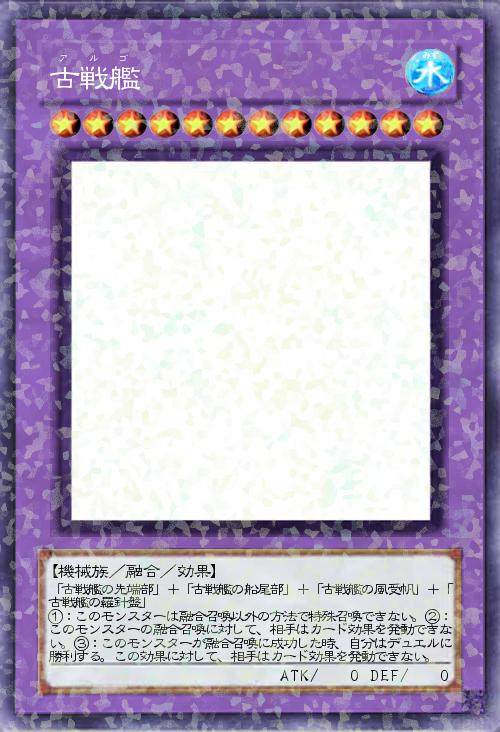 「古戦艦の先端部」+「古戦艦の船尾部」+「古戦艦の風受帆」+「古戦艦の羅針盤」 ①:このモンスターは融合召喚以外の方法で特殊召喚できない。②:このモンスターの融合召喚に対して、相手はカード効果を発動できない。③:このモンスターが融合召喚に成功した時、自分はデュエルに勝利する。この効果に対して、相手はカード効果を発動できない。 |