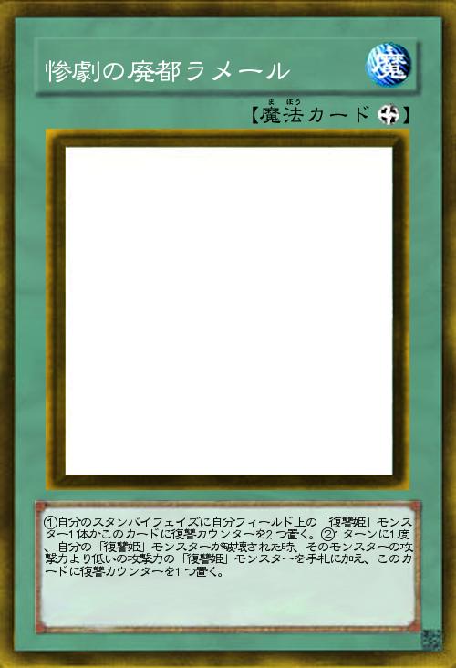 | ①自分のスタンバイフェイズに自分フィールド上の「復讐姫」モンスター1体かこのカードに復讐カウンターを2つ置く。②1ターンに1度、自分の「復讐姫」モンスターが破壊された時、そのモンスターの攻撃力より低いの攻撃力の「復讐姫」モンスターを手札に加え、このカードに復讐カウンターを1つ置く。 | |||