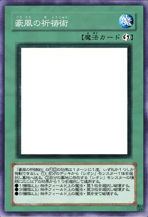 「豪風の祈祷術」の①②の効果は1ターンに1度、いずれか1つしか発動できない。①:自分のデッキから「シオン」モンスター1体を選択し墓地へ送る。②自分の墓地に存在する「シオン」モンスターの種類に応じ以下の効果から1つを選択して適用する。 ●1種類以上:相手フィールド上の魔法・罠1枚を選択し破壊する。●3種類以上:相手フィールド上の魔法・罠3枚を選択し破壊する。●5種類以上:相手フィールド上の魔法・罠を全て破壊する。 |