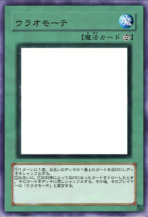 ①1ターンに1度、お互いのデッキの1番上のカードを反対にしデッキをシャッフルする。 ②お互いに、①の効果によって反対になったカードをドローしたとき、そのカードをデッキに戻しシャッフルする。その後、そのプレイヤーは「ウラオモーテ」と宣言する。 |