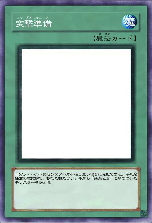 | 自分フィールドにモンスターが存在しない場合に発動できる。手札を任意の枚数捨て、捨てた数だけデッキから「銃装乙女」と名のついたモンスターを加える。 | |||