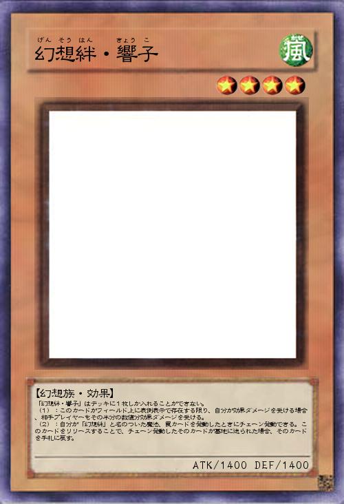「幻想絆・響子」はデッキに1枚しか入れることができない。 (1):このカードがフィールド上に表側表示で存在する限り、自分が効果ダメージを受ける場合、相手プレイヤーもその半分の数値分効果ダメージを受ける。 (2):自分が「幻想絆」と名のついた魔法、罠カードを発動したときにチェーン発動できる。このカードをリリースすることで、チェーン発動したそのカードが墓地に送られた場合、そのカードを手札に戻す。 |
