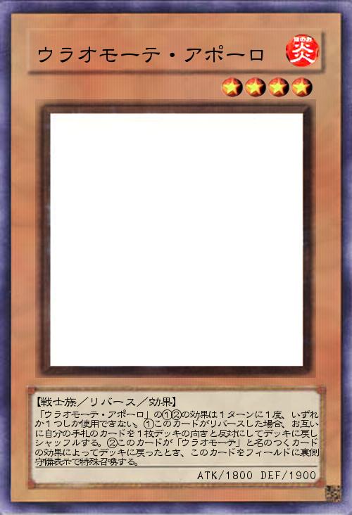 「ウラオモーテ・アポーロ」の①②の効果は1ターンに1度、いずれか1つしか使用できない。①このカードがリバースした場合、お互いに自分の手札のカードを1枚デッキの向きと反対にしてデッキに戻しシャッフルする。②このカードが「ウラオモーテ」と名のつくカードの効果によってデッキに戻ったとき、このカードをフィールドに裏側守備表示で特殊召喚する。 |